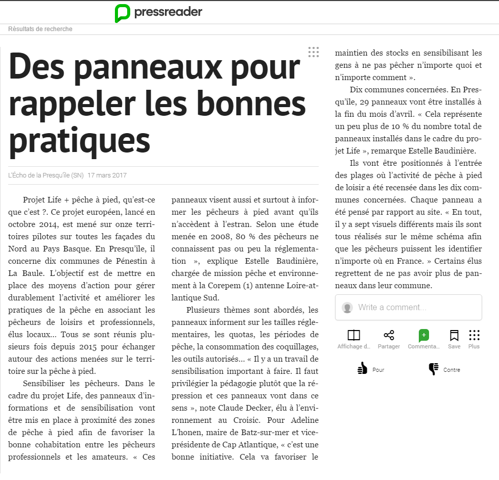 - Les panneaux d'informations sur la pêche à pied de loisir : Ouest France, 15/03/2017 - L'écho de la Presqu'île, 17/03/2017 - Le Marin, 30/03/2017