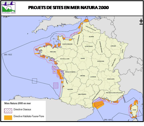 257 sites Natura 2000 marins ont été désignés à ce jour sur le territoire national (184 sites mixtes terre-mer et 73 sites entièrement marins). Ces sites couvrent 8,4 % des eaux sous juridiction française de métropole (40% des eaux territoriales).